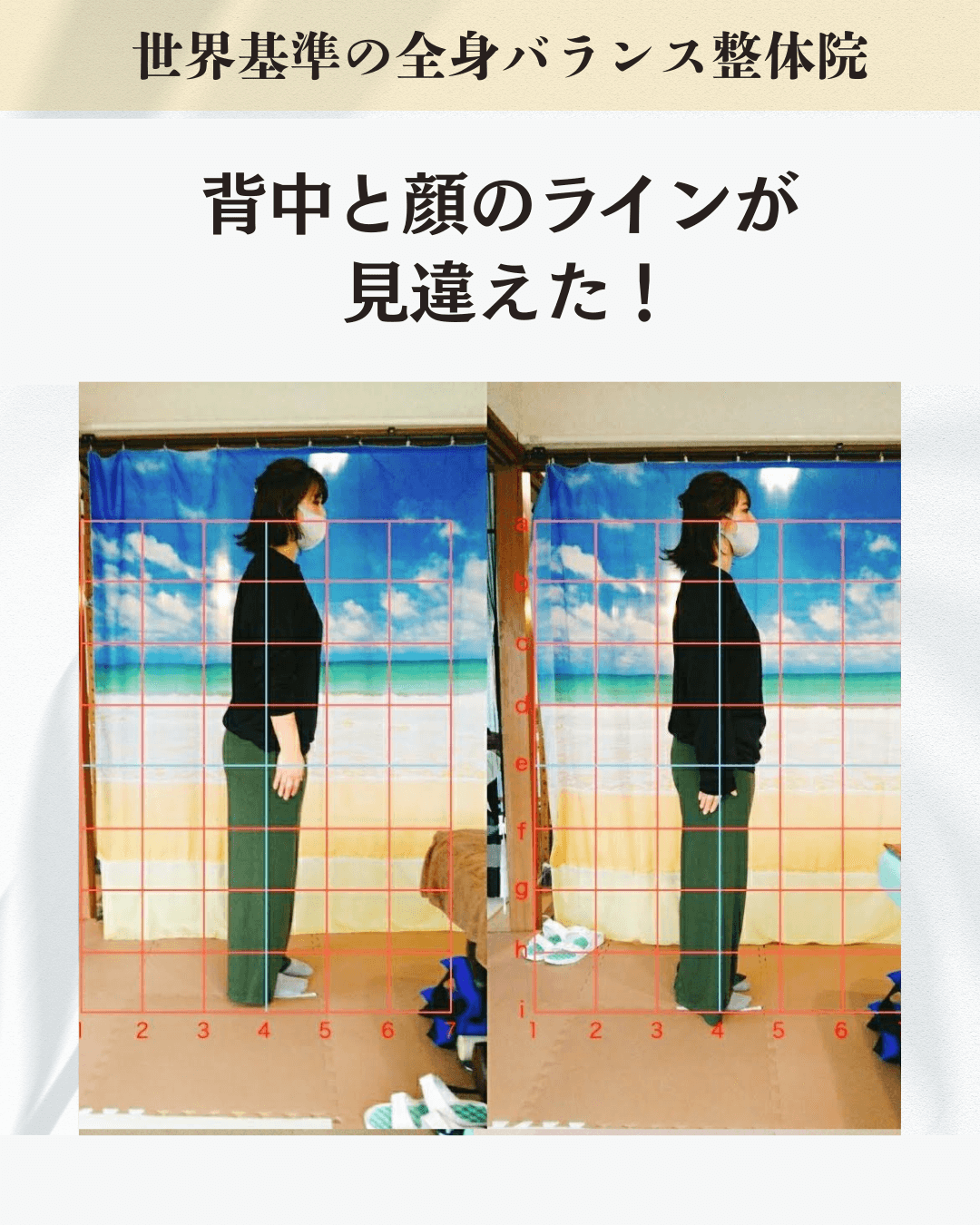 「私は姿勢が悪い自覚はなかった」「見た目だけが気になる」そんな方でも、実際に評価してみると多くの方に重心・肩の高さ・骨盤ねじれが起きています。