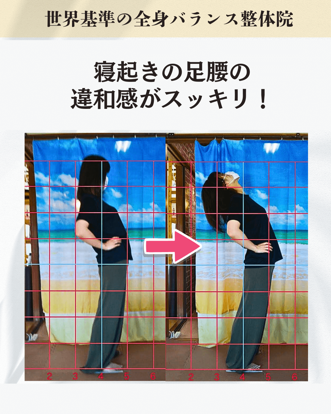 | 寝起きの足首・腰の痛み | 歪みチェック・関節矯正・筋肉活性化 | 立ち上がり時の痛み軽減 |