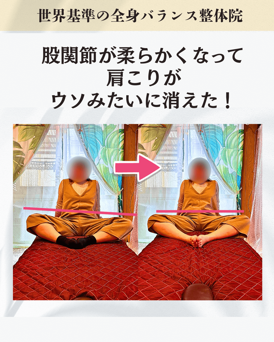このお客様の場合も、施術前は明らかに右膝が高く、左右のバランスが崩れていましたが、施術後の写真では膝の高さがほぼ均等になっていました。