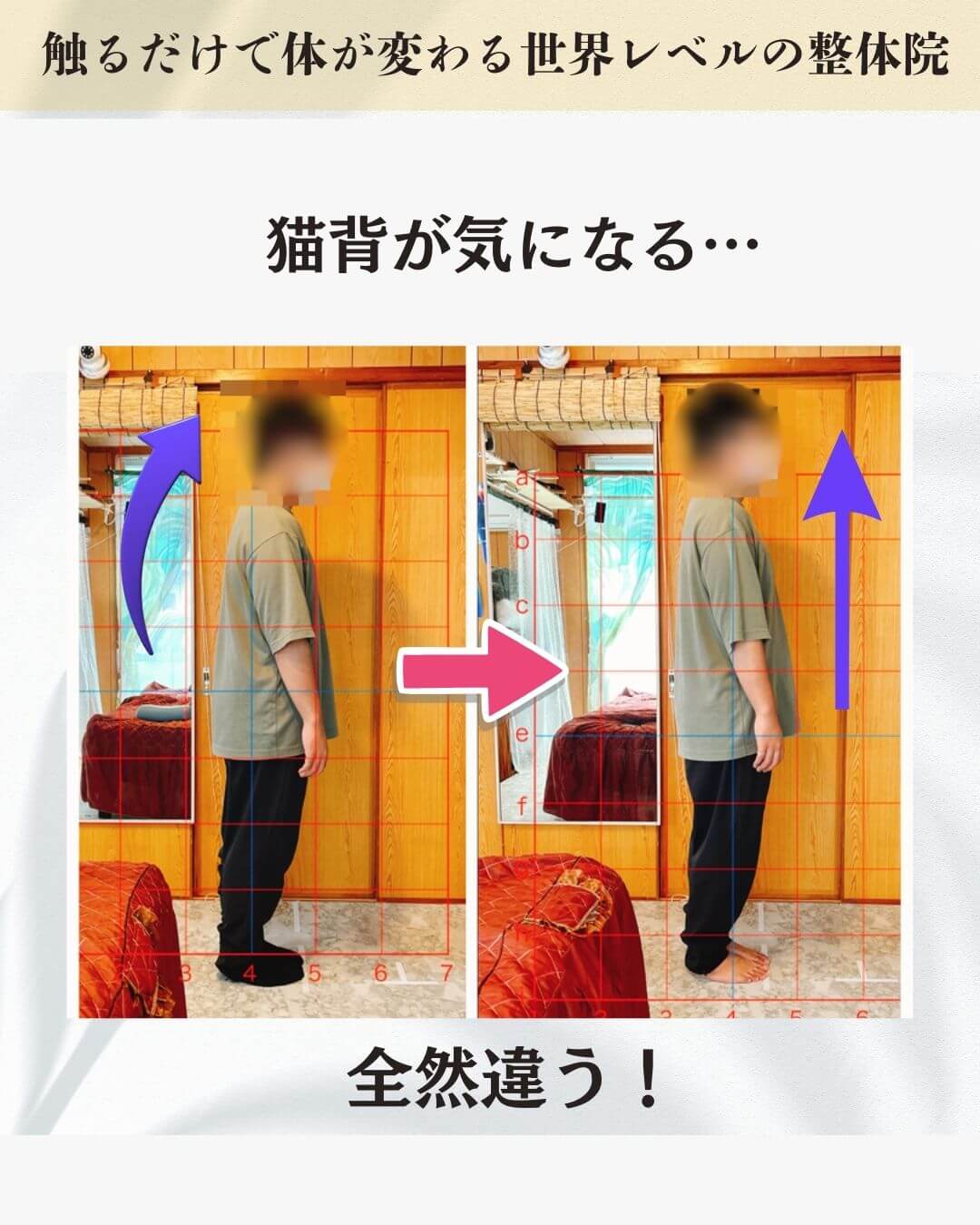 サプライズ整体院では、施術前後の変化を写真で記録します。T様の場合も、同じ位置・同じ姿勢で撮影した写真を見比べると、その違いは歴然でした。