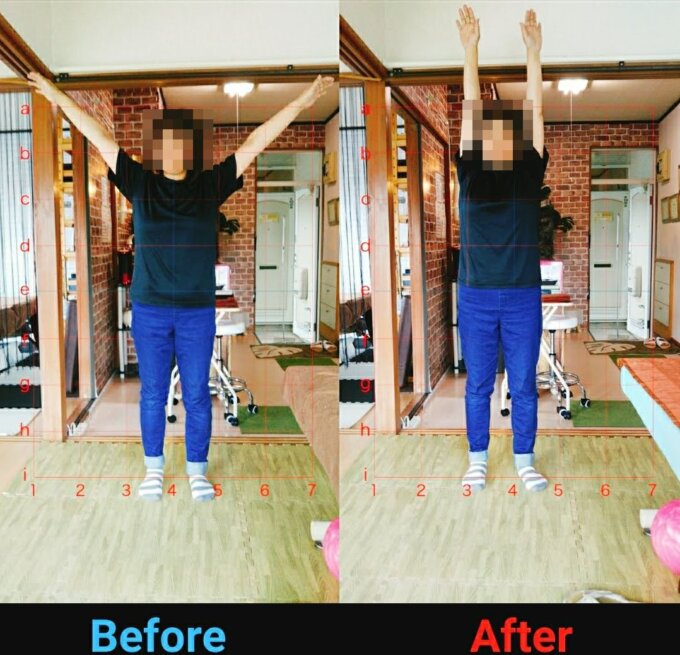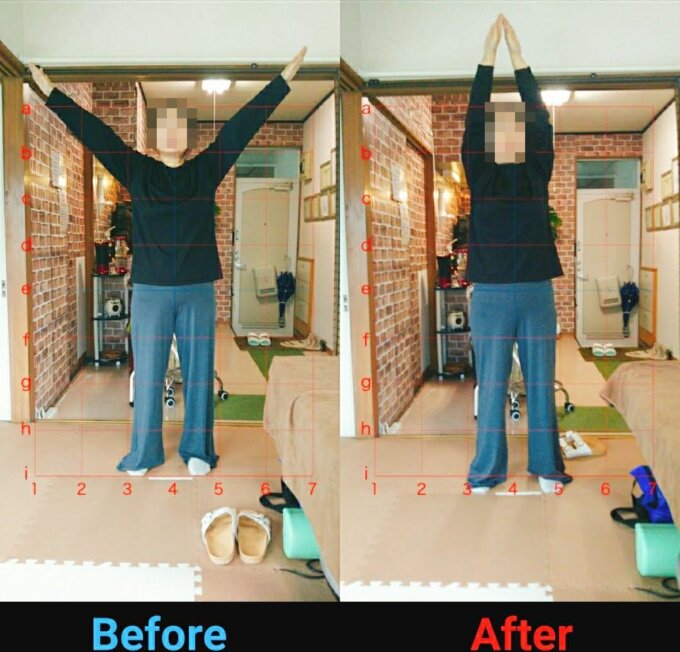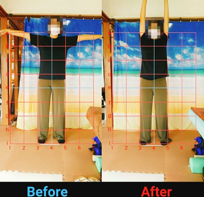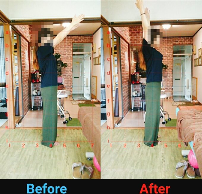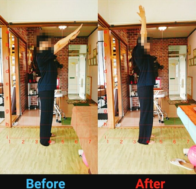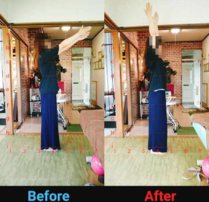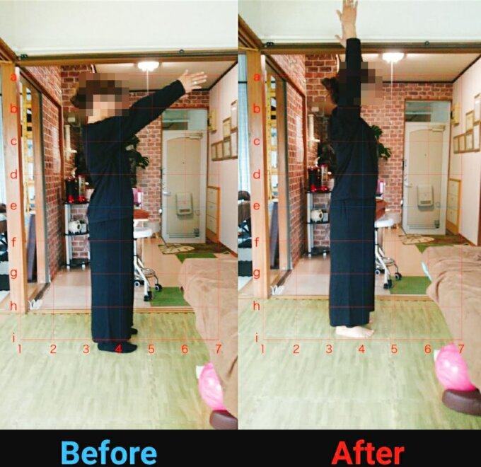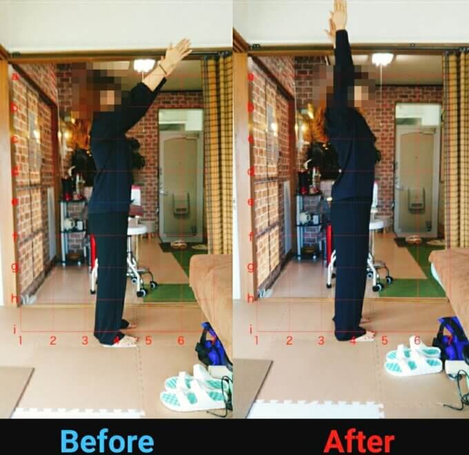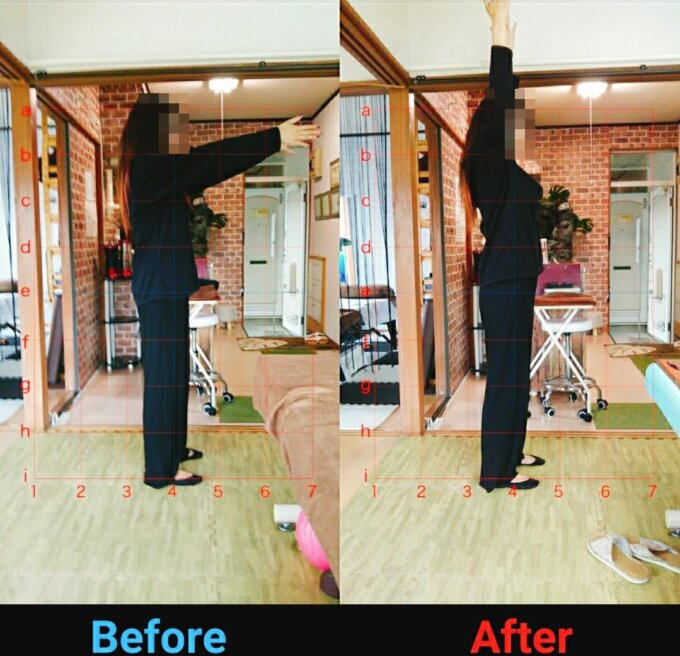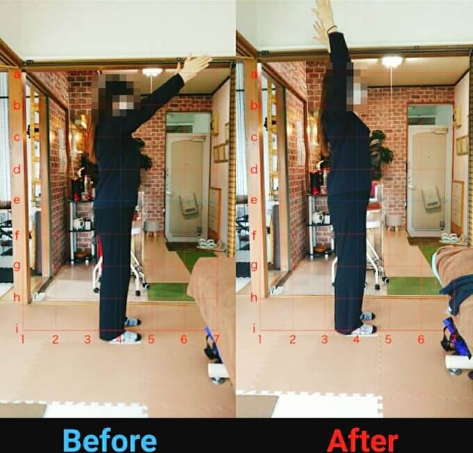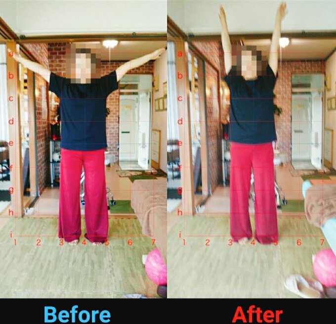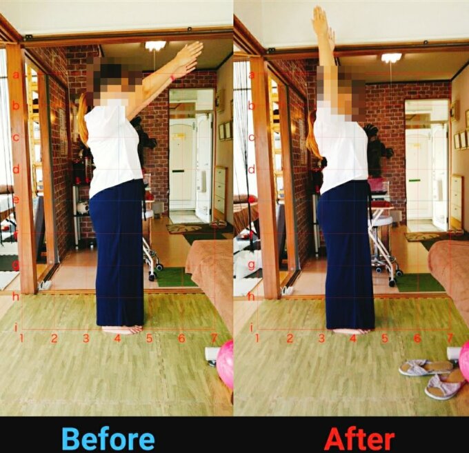 ビフォーでは上がらなかった腕、反れなかった腰がアフターではしっかり上がり、腰も背後が見れるくらい反れました。