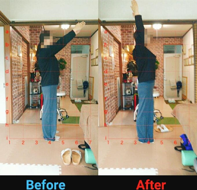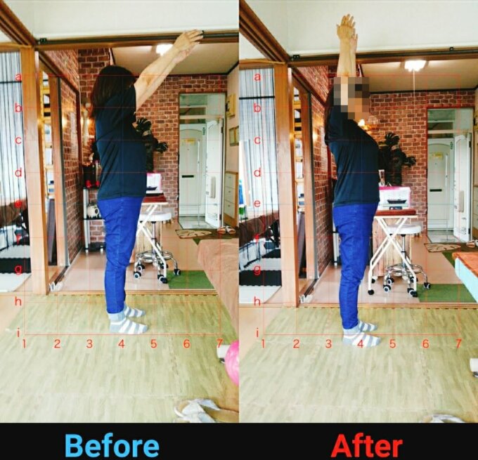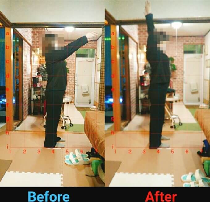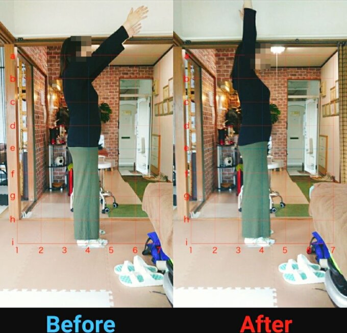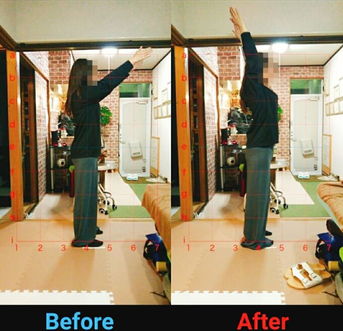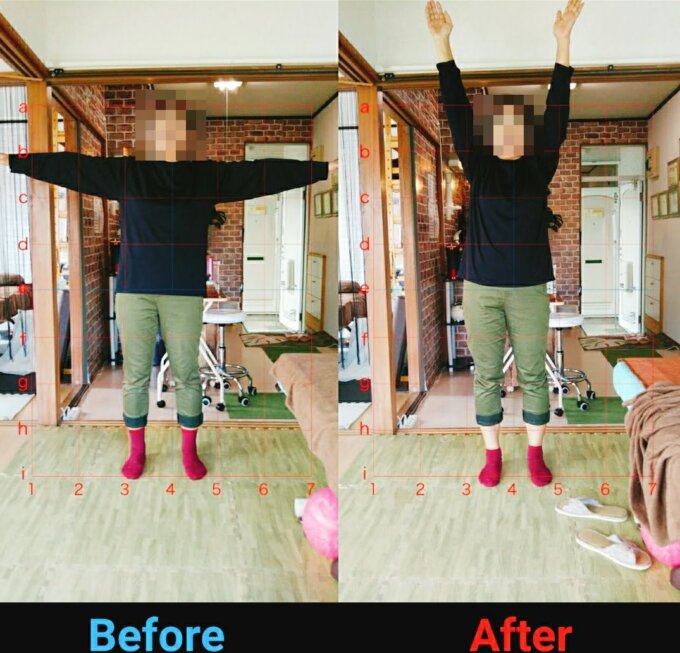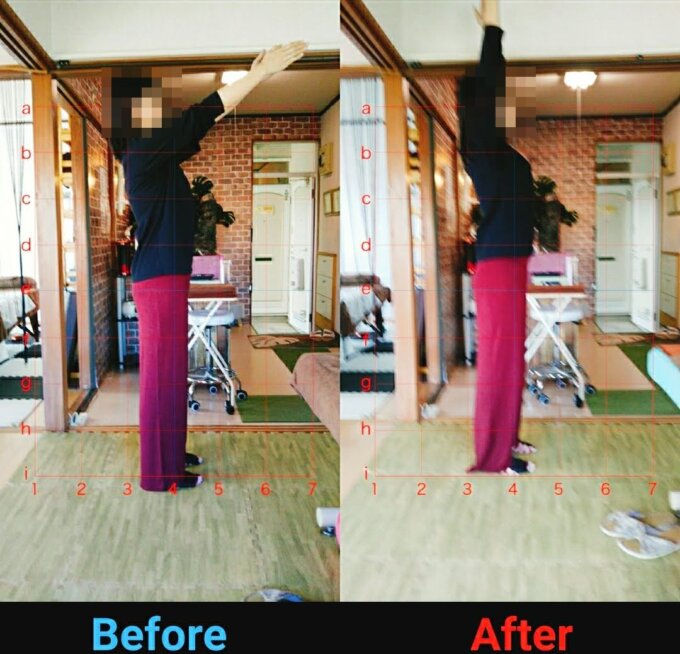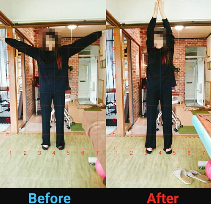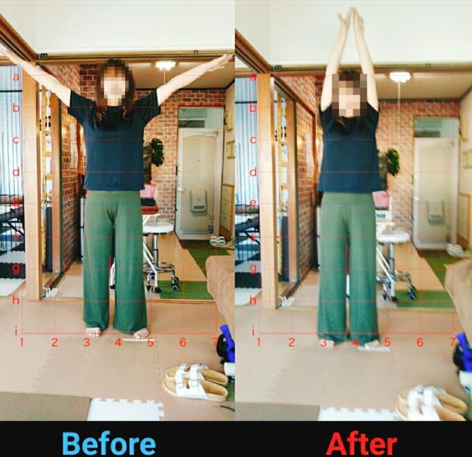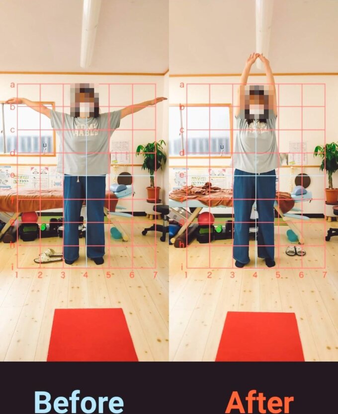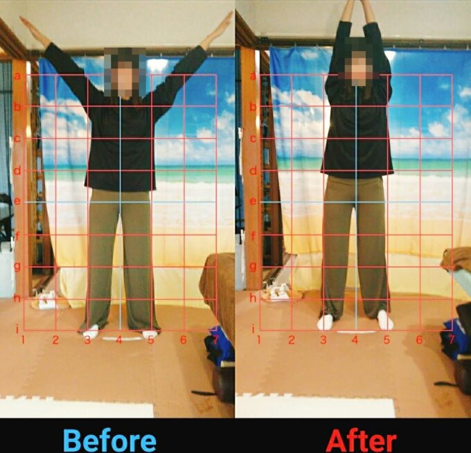 ビフォーでは上がらなかった腕、反れなかった腰がアフターではしっかり上がり、腰も背後が見れるくらい反れました。