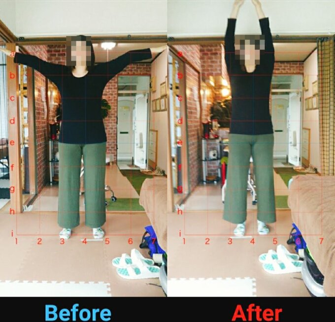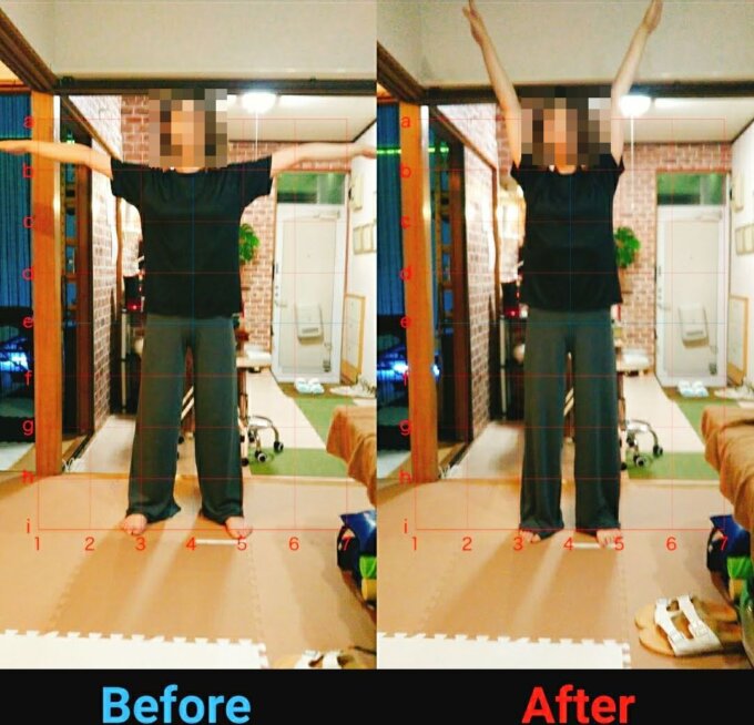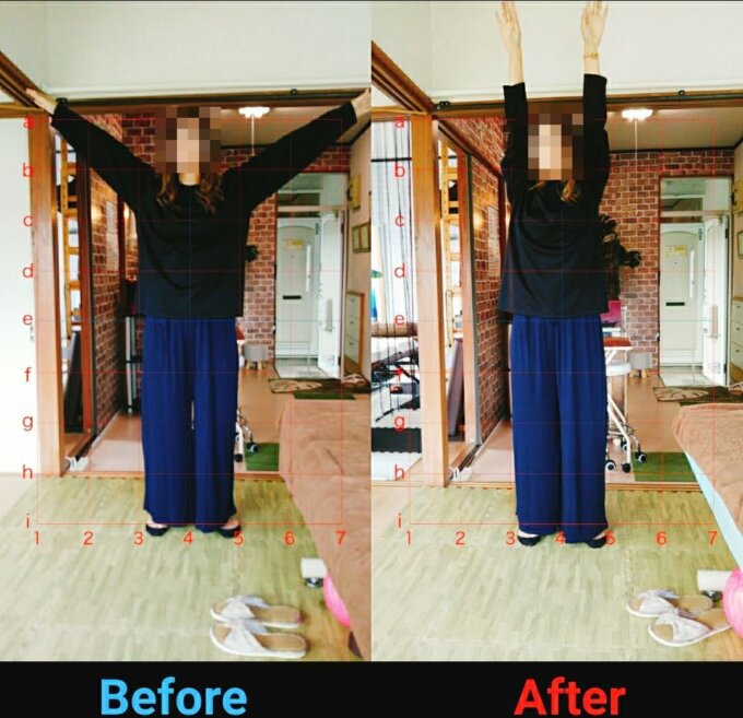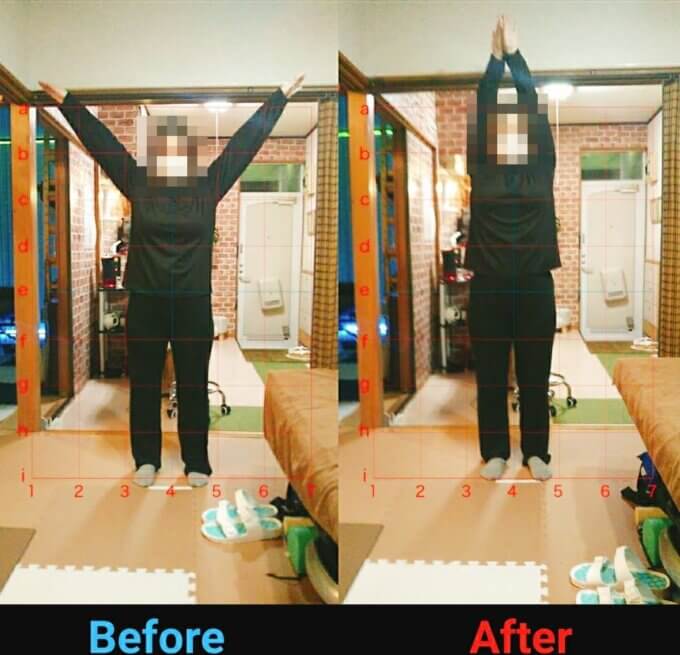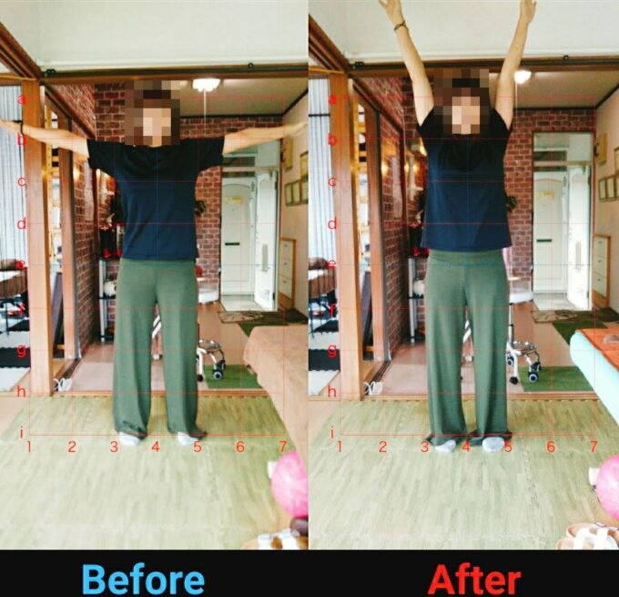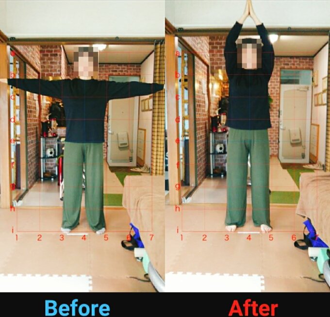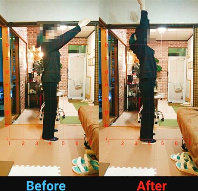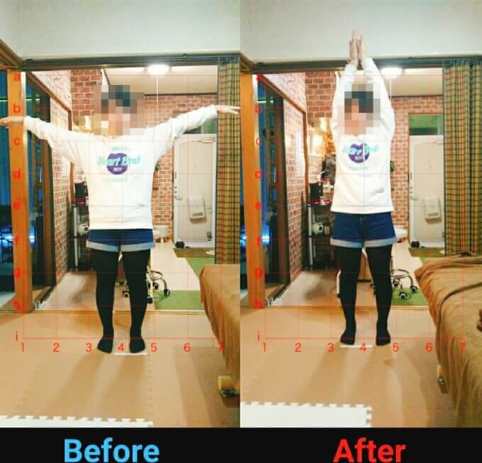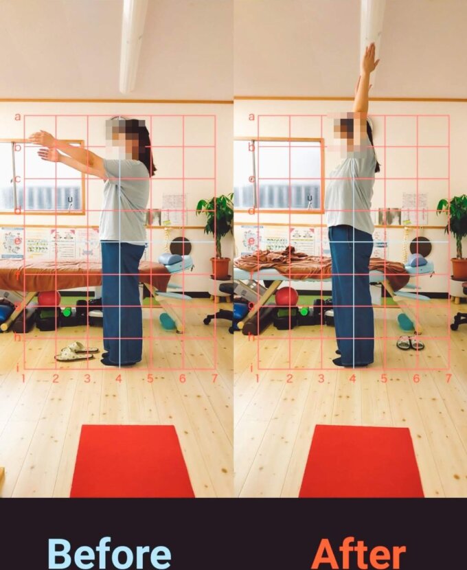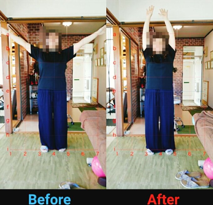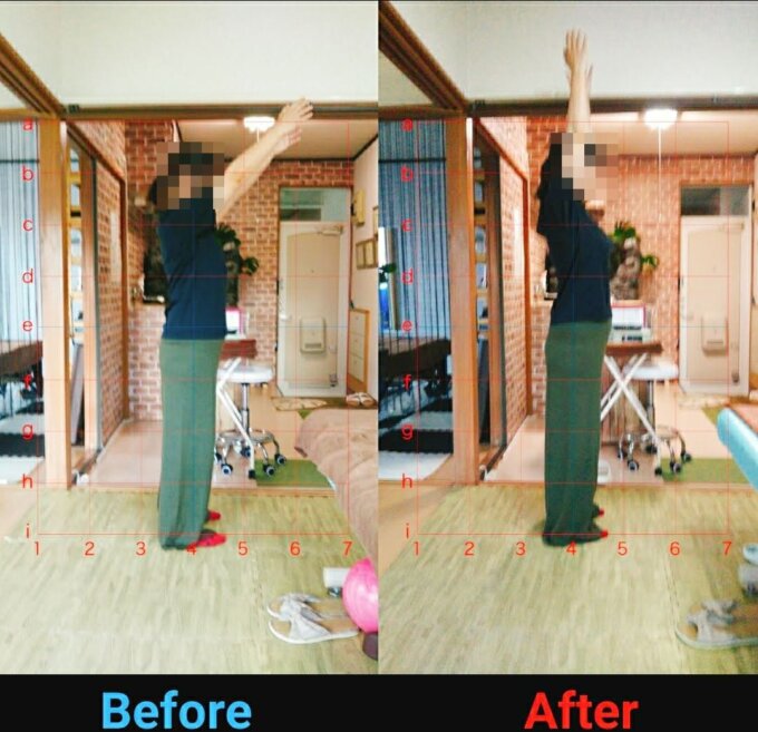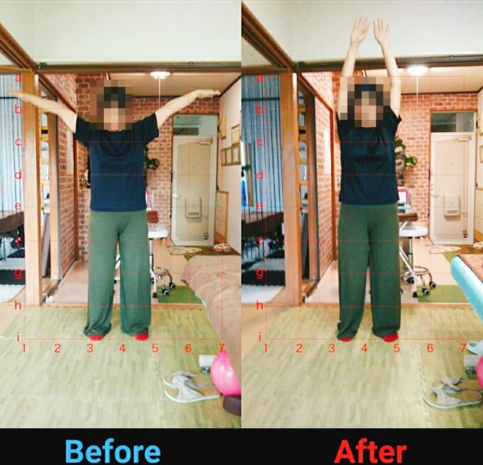 ビフォーでは上がらなかった腕、反れなかった腰がアフターではしっかり上がり、腰も背後が見れるくらい反れました。