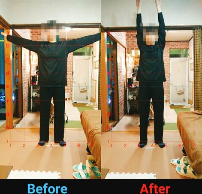 しかし効果は抜群でビフォーアフターの写真でも一目瞭然で姿勢は理想の姿勢に肩こりも大分軽減され腰痛も後ろに